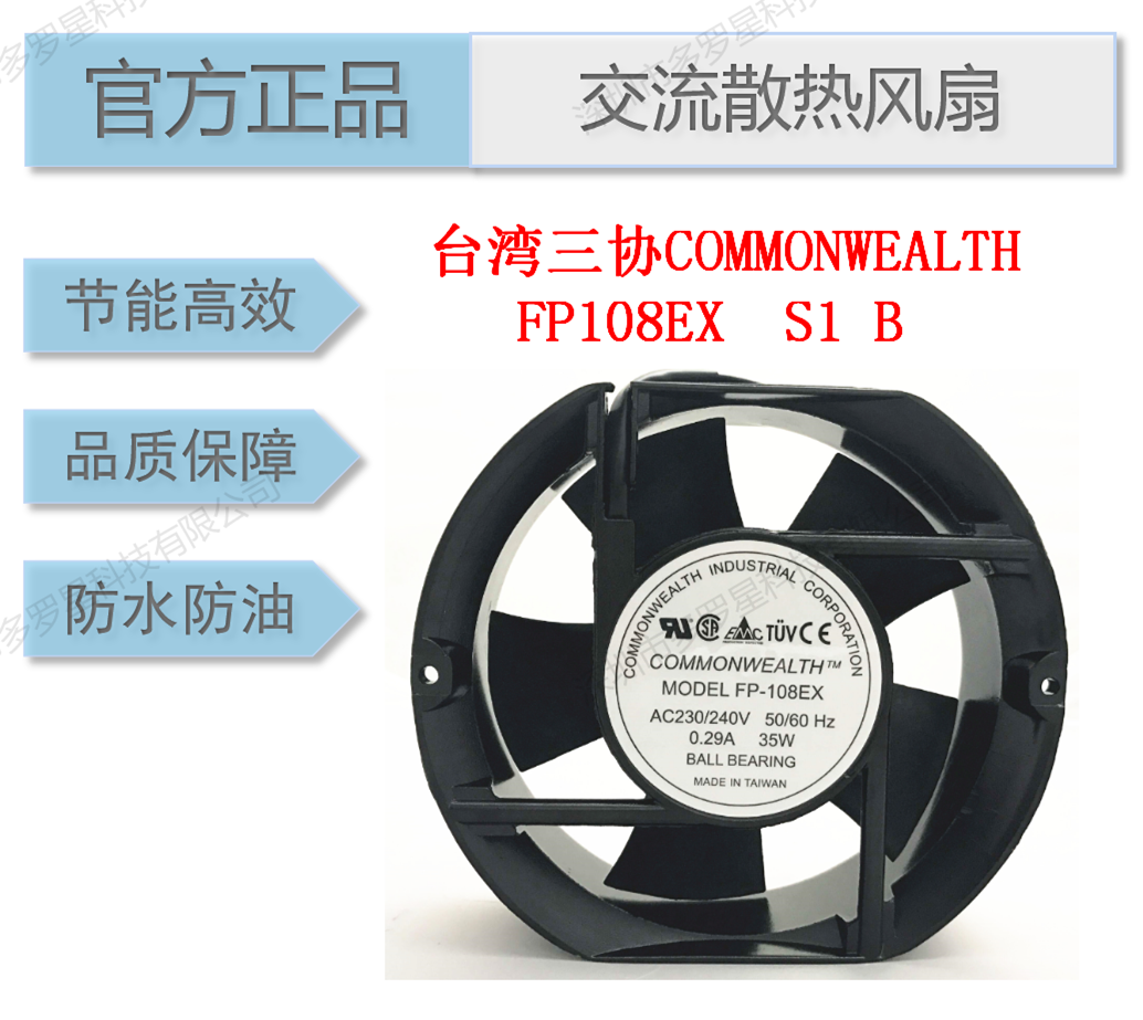 以FP108EX-S1-B風(fēng)扇為例:正品臺灣三協(xié)的英文名稱是“COMMONWEALTH”,型號“FP-108EX-S1-B”,型號都是